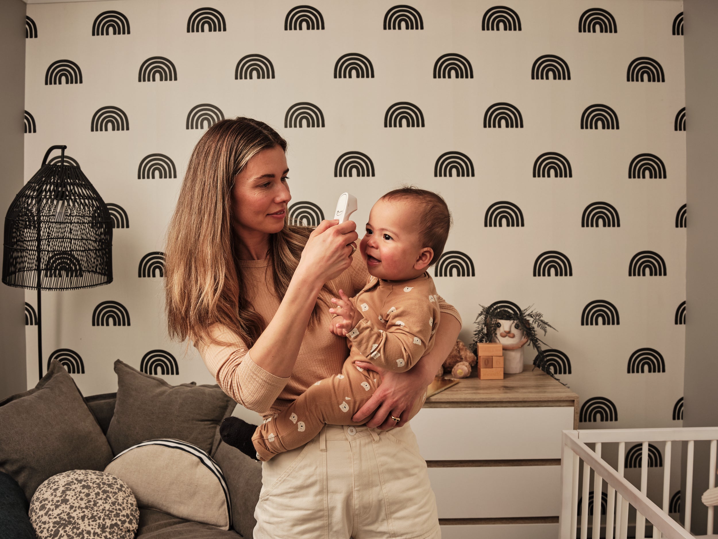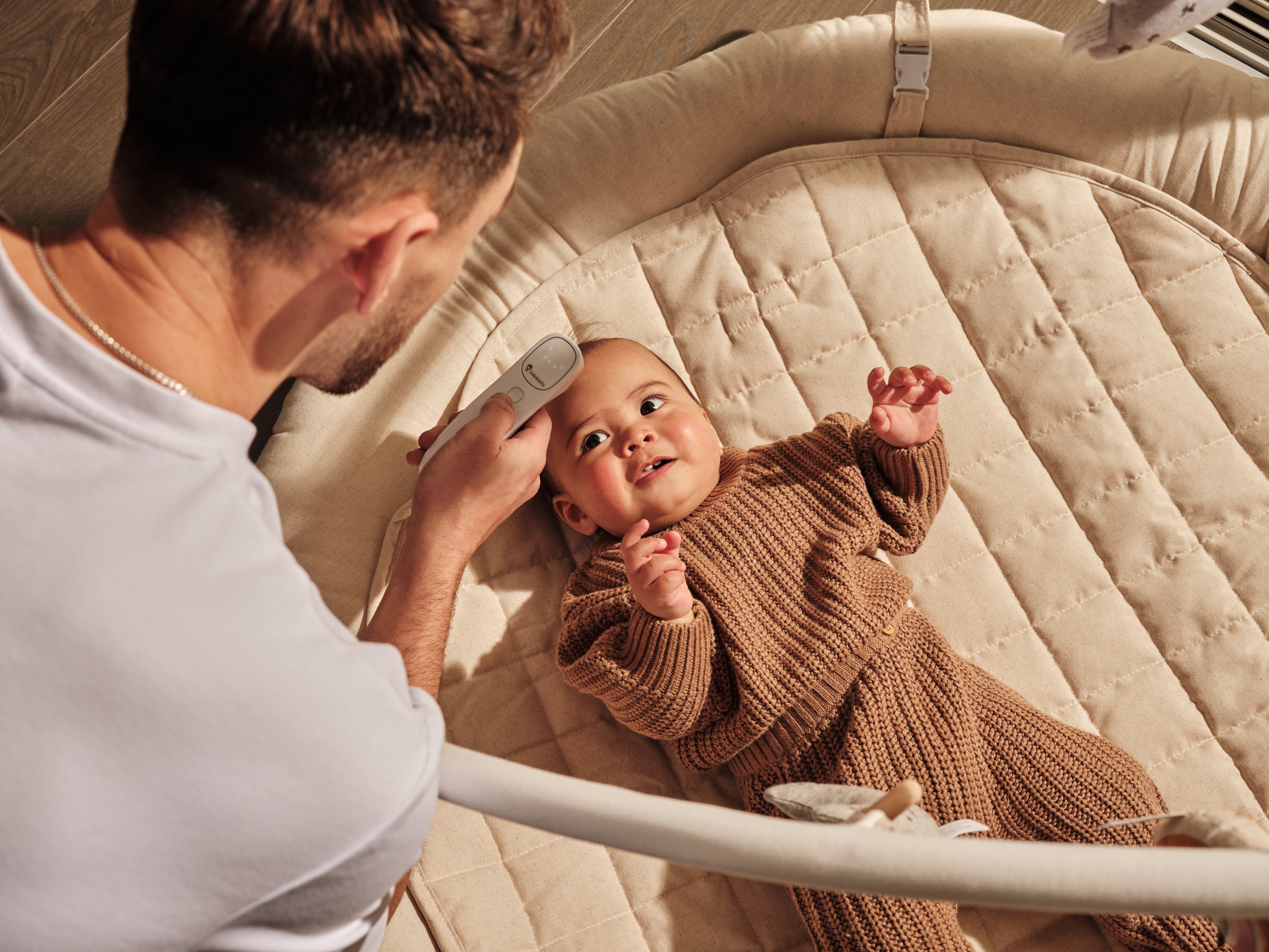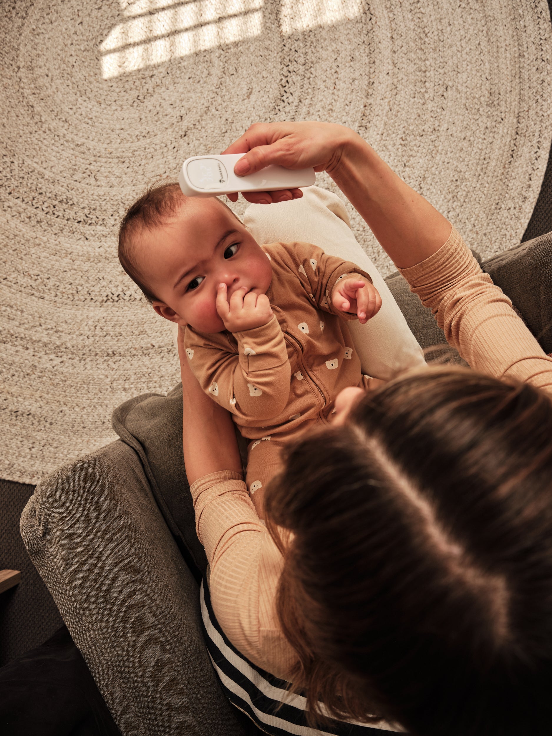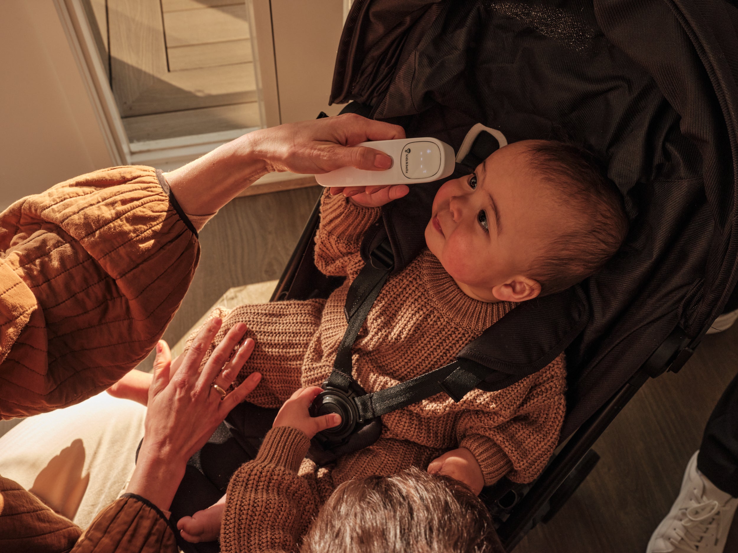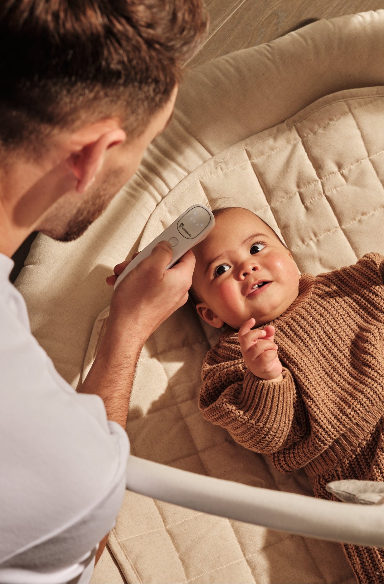 Our thermometer uses advanced infrared technology to read temperature without physical contact. Simply hold the sensor 1-3 cm away from the forehead (in between the eyes) press the button, and get an instant reading. This method is hygienic, non-invasive, and perfect for checking a sleeping baby without waking them up.