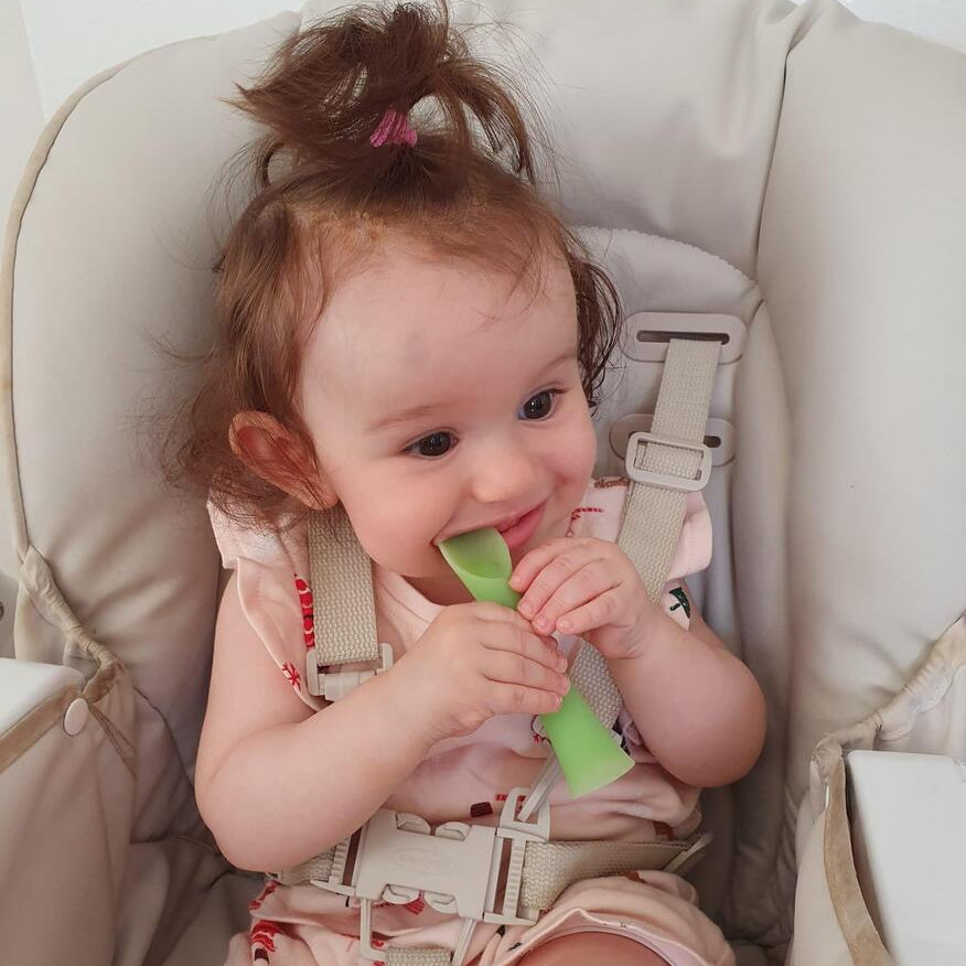 Yes! Because the spoon is made of soft, durable silicone, it is soothing for sore gums. Many parents find their little ones enjoy chewing on the textured handle or the spoon tip for relief during teething phases.
